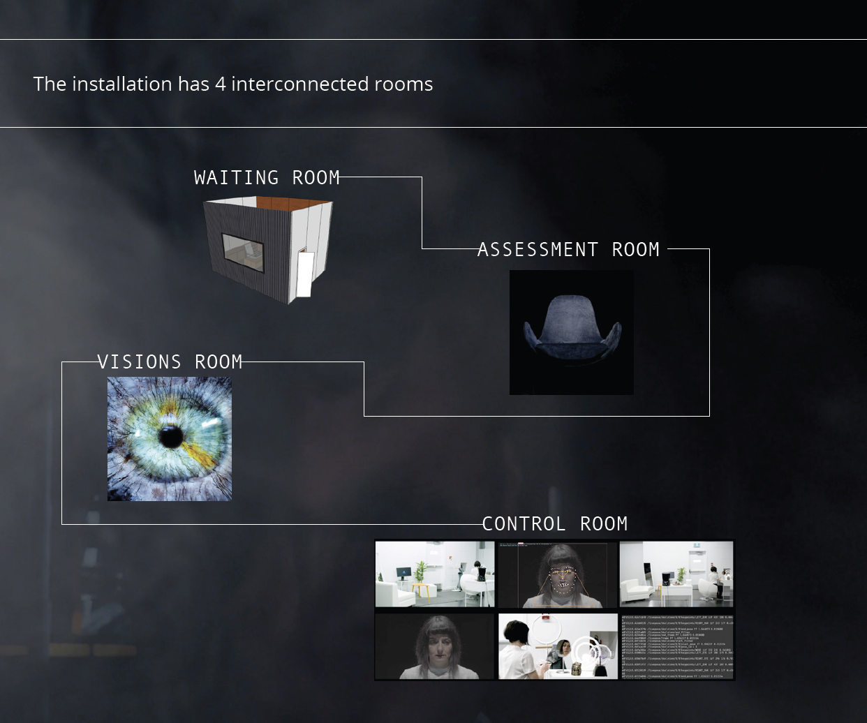 The audience is invited into an observation room, looking into a seemingly private space through a one-way mirror. At the begining of the installation, the audience can see without being seen. This setup brings attention to our natural curiosity and the idea of surveillance, encouraging viewers to recognize their own urge to observe. The public is introduced to three protagonists, Seeker 1, Seeker 2 and Seeker 3, who appear and disappear in turns, coming back from a mysterious experience. This cycle stirs the viewer’s curiosity, inviting them to follow one of the Seekers' journeys to learn more.